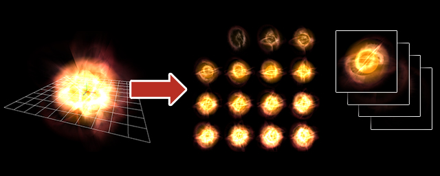 Allows you to output the created effect as a sprite sheet, gif animation, AVI, etc. This function is very useful in situations such as when posting effects on your Twitter/Blog/Website/etc., or other situations where you cannot directly play effects created with Effekseer, through the runtime or otherwise.
