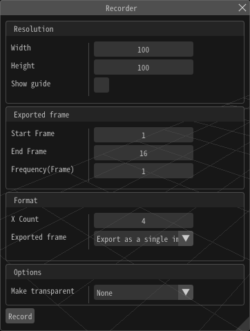 Effekseer allows you to output sprite sheets and gif animations of your effects recorded at regular intervals. When "Window ->Record" is selected in the menu bar, "Recording Window" is displayed. Here, you can change the recording parameters such as the size or the frequency to record pictures for your sprite sheets or gifs.