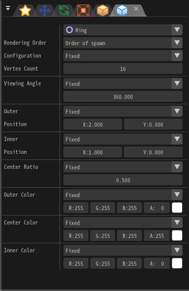 You can express various shapes by changing the number of vertices composed 0f the ring. In the initial setting, the number of vertices is large, so the particles look like circles. Reducing the number of vertices allows you to express shapes such as triangles, rectangles, and hexagons.
