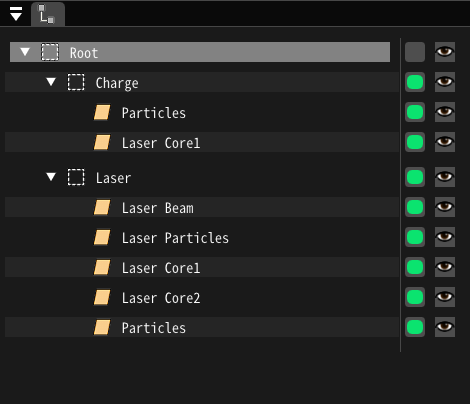 Chargenode particles are deleted and particle generation in child nodes stopsLasernode particles start generating and child node particles are also generated