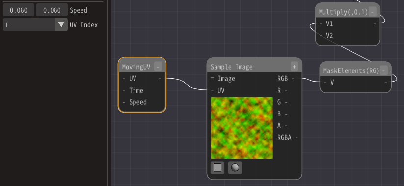 A MovingUV node outputs the value of the moving UV over time.