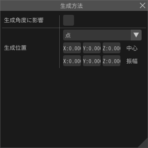 パーティクルが最初に生成される位置を指定するためのパラメーターを設定します。 親のパーティクルの位置が子のパーティクルに与える影響に加えて、ここで設定した値が影響を与えます。 すなわち、親のパーティクルの位置を原点として、この生成方法で指定した分の値だけ移動・回転した位置を中心にパーティクルが生成されます。