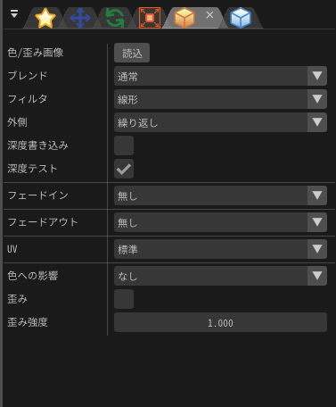 マテリアルのファイルにより、そのマテリアルに応じたパラメーターが増えることがあります。 カスタムパラメーターには定数以外にもイージングやFカーブといった方法によりパラメーターを指定できます。 カスタムパラメーターの表示される名称はマテリアルのファイルによって変わります。