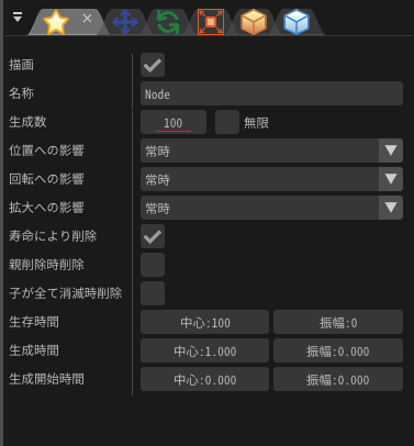パーティクルの数は、共通ウインドウの生成数に設定されています。 この数を増やすと、たくさんのパーティクルが生成されるようになります。