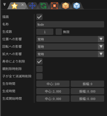 まず、画面の右側の「ノードツリー」の「Node」をクリックします。「ノードツリー」のウインドウは エフェクト全体の構成を示しており、「Node」はパーティクルを示しています。これを編集することにより、 このパーティクルの形状を編集できます。