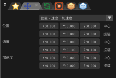 位置ウインドウの速度のxyzの振幅に0.1と入力しましょう。さらに、先ほど中心に入力した0.1を0に戻します。