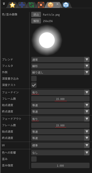 パーティクルが突然、出現したり、消えたりするのは不自然です。 フェードイン、フェードアウトを設定して、透明度が変化するようにしましょう。