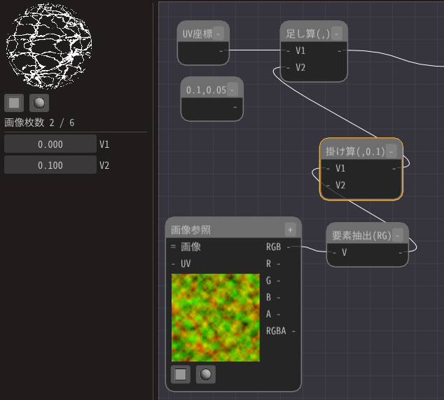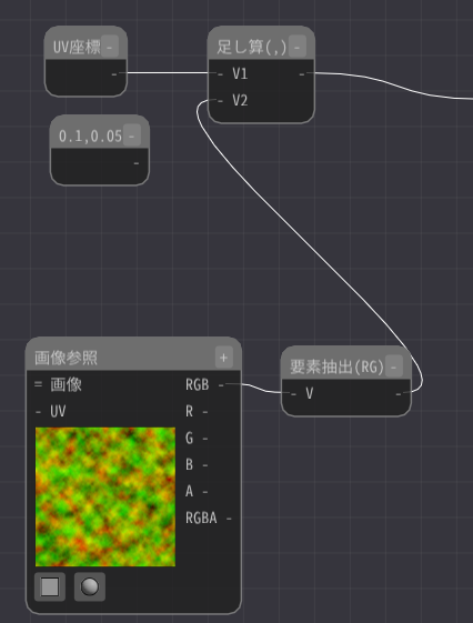 そして、定数2ノードとUV座標ノードを足し算ノードに接続します。