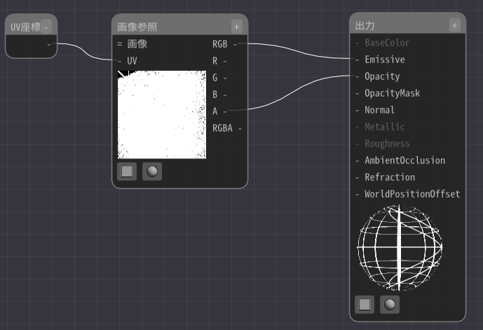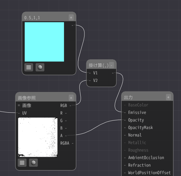 そこで画像参照ノードのAから出力ノードのOpacityに接続します。