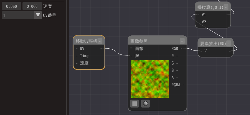移動UV座標ノードは時間経過で移動するUVの値を出力します。
